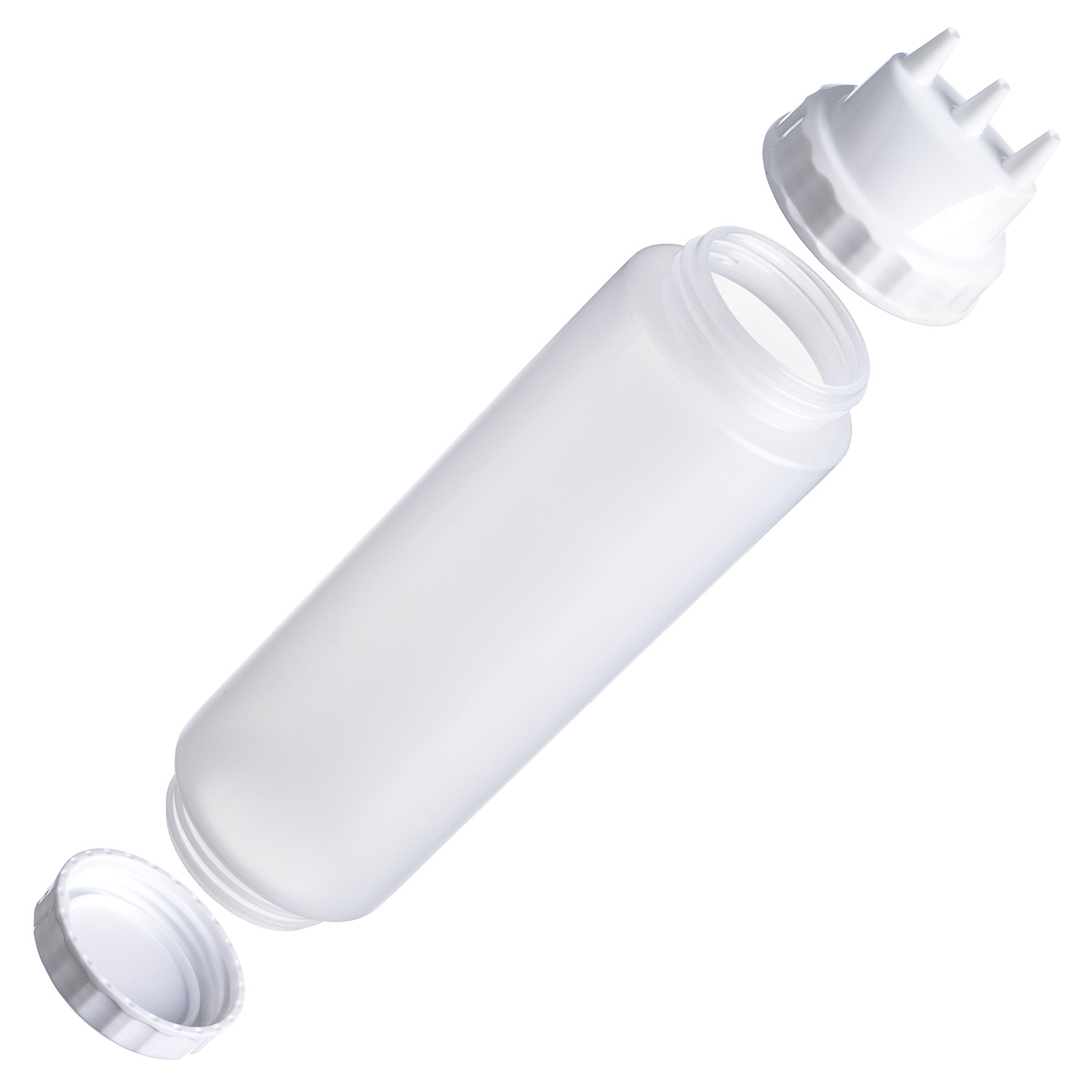 Емкость для соуса 1000 мл. d=75 мм. h=290 мм. c 2 крышками 3 носика, широкая прозрачная, крышки белые GP /1/96/