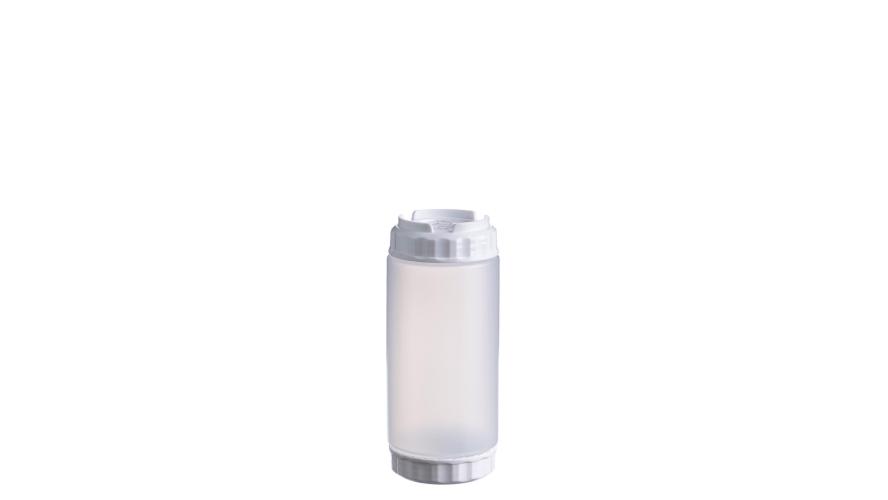 Емкость для соуса 500 мл выполнена из прочного пищевого пластика и предназначена для профессионального использования в сегменте HoReCa. Конструкция имеет две откручивающиеся крышки и съемный силиконовый клапан, что обеспечивает удобство наполнения, использования и ухода, а также позволяет дозировать содержимое без подтеков и экономит место для хранения. Белый цвет служит маркировкой для майонеза и других белых соусов. Прозрачный корпус облегчает визуальный контроль содержимого. Подходит для мытья в посудомоечной машине.
