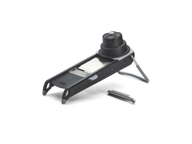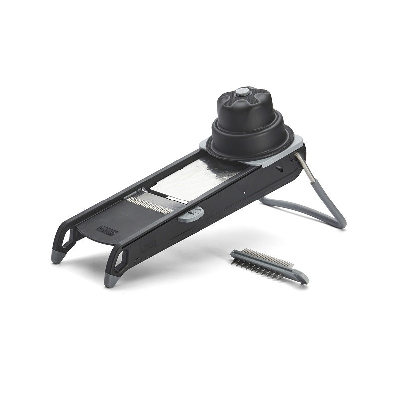 Сменные лезвия «Жюльен» расположены под овощерезкой, две складные ножки.