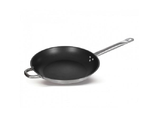 Сковорода из нержавеющей стали с толстым дном и тефлоновым покрытием используется для тушения, обжарки и томления ингредиентов.