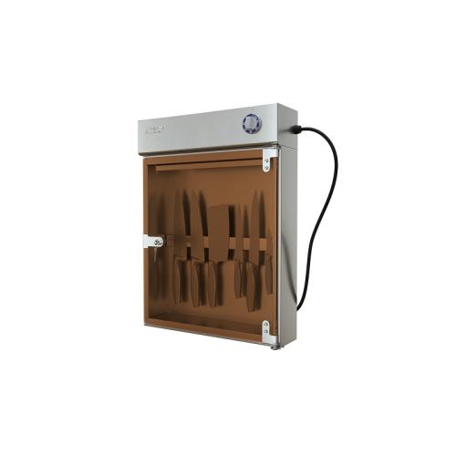 Дверь оснащена замком. Держатель для ножей выполнен из нержавеющей стали и рассчитан на 18 ножей.