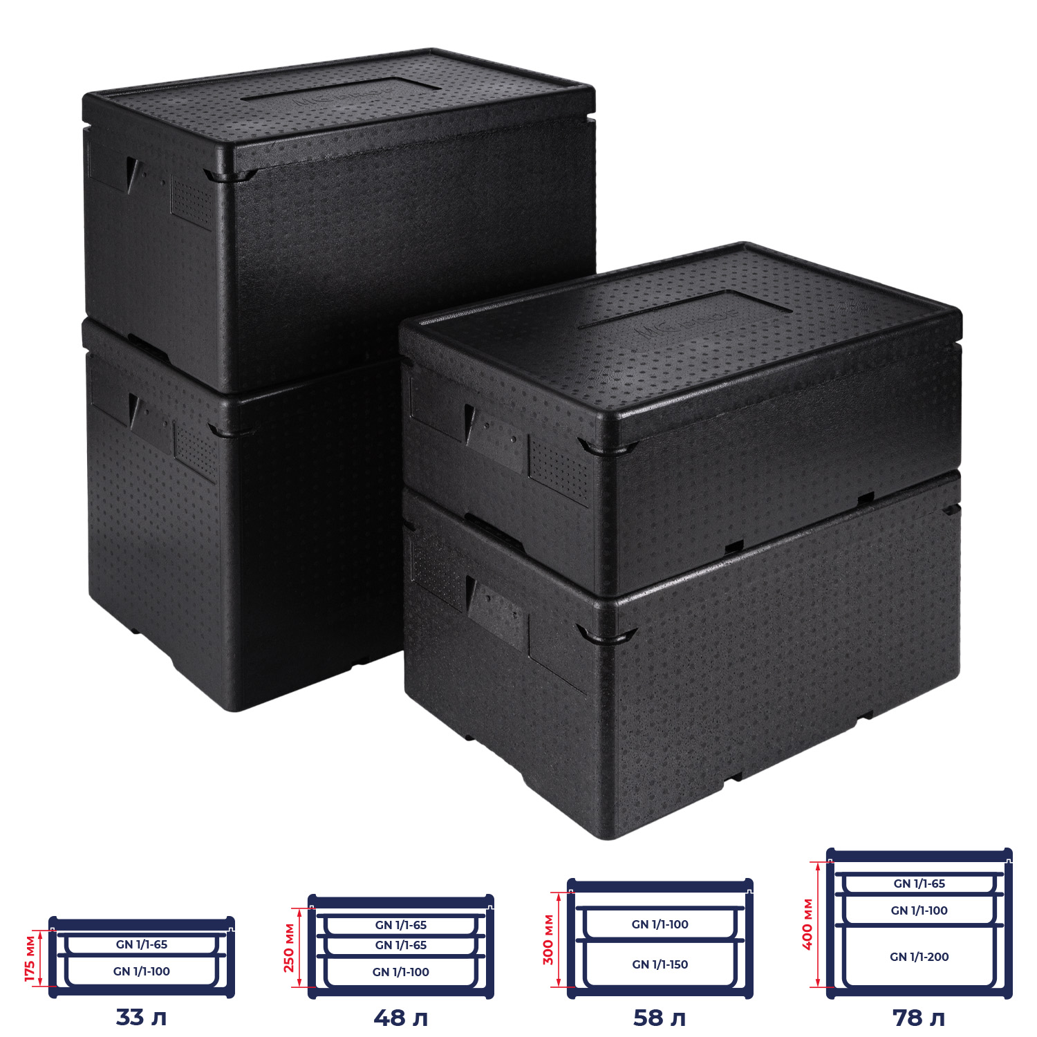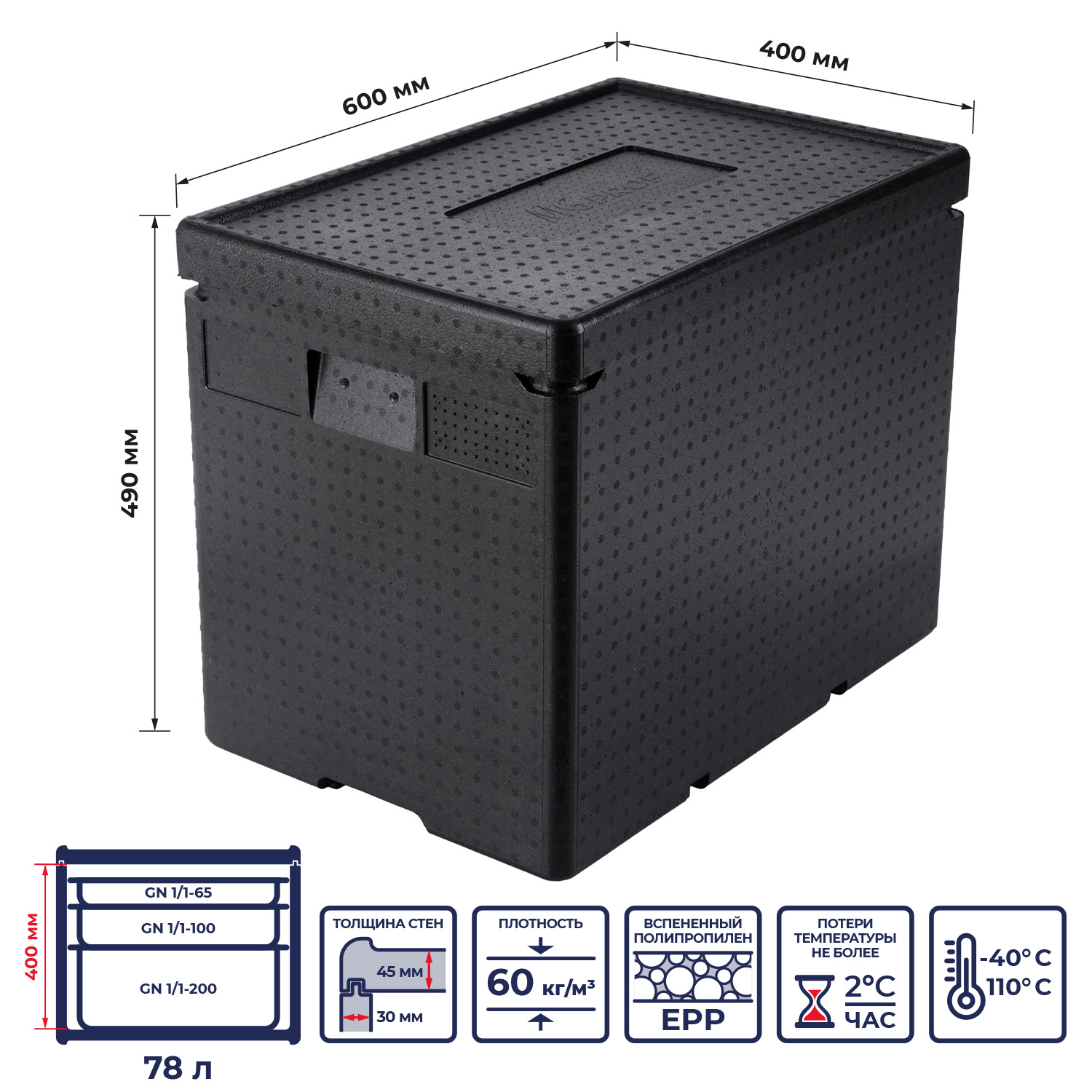 string(1816) "Термоконтейнер MGprof объемом 78 литров — идеальное решение для хранения и транспортировки продуктов в гастроемкостях 1/1, 1/2, 1/3 различной высоты, а также в порционных упаковках. Размеры контейнера 600*400*490 мм, внутренние габариты 540*360*400 мм. обеспечивают удобство и универсальность использования. Изготовлен из прочного и легкого вспененного полипропилена с плотностью 60 кг/м³, что гарантирует надежность и долговечность термоконтейнера.